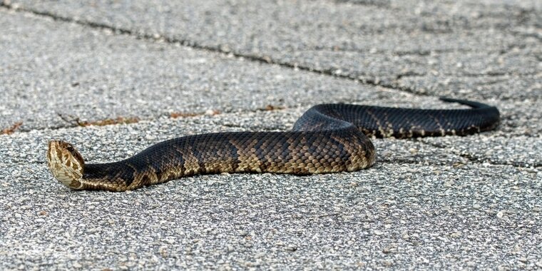 Cottonmouth snakes are semi-aquatic pit vipers with potent venom and may stand their ground with open-mouth threat displays.