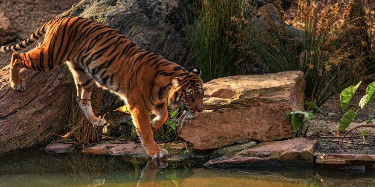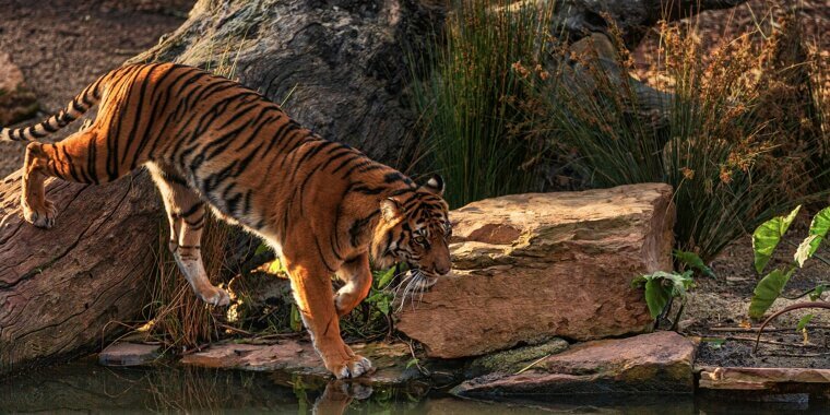 Bengal tigers in mangrove swamps often ambush animals near water, dragging them under to drown before feeding.